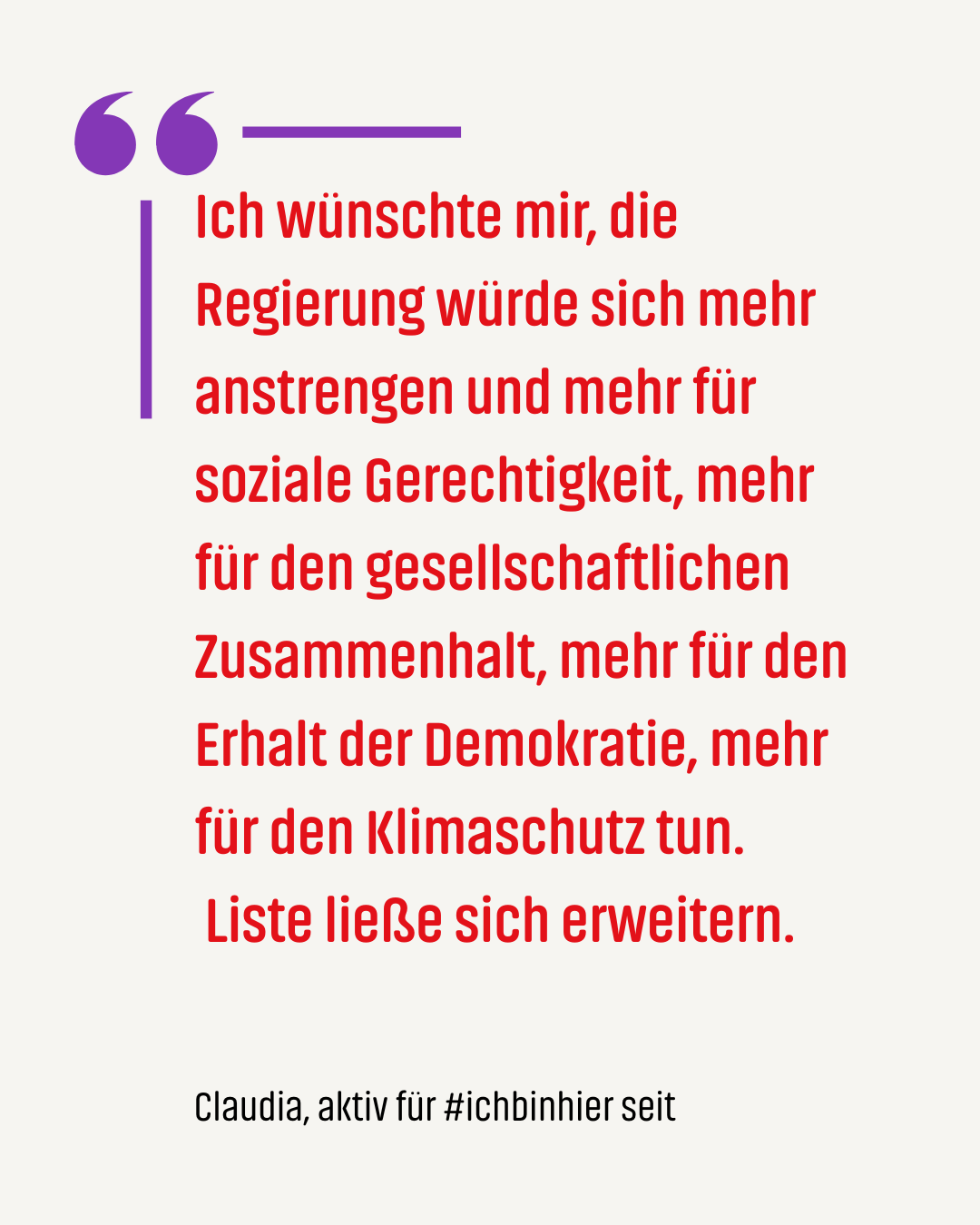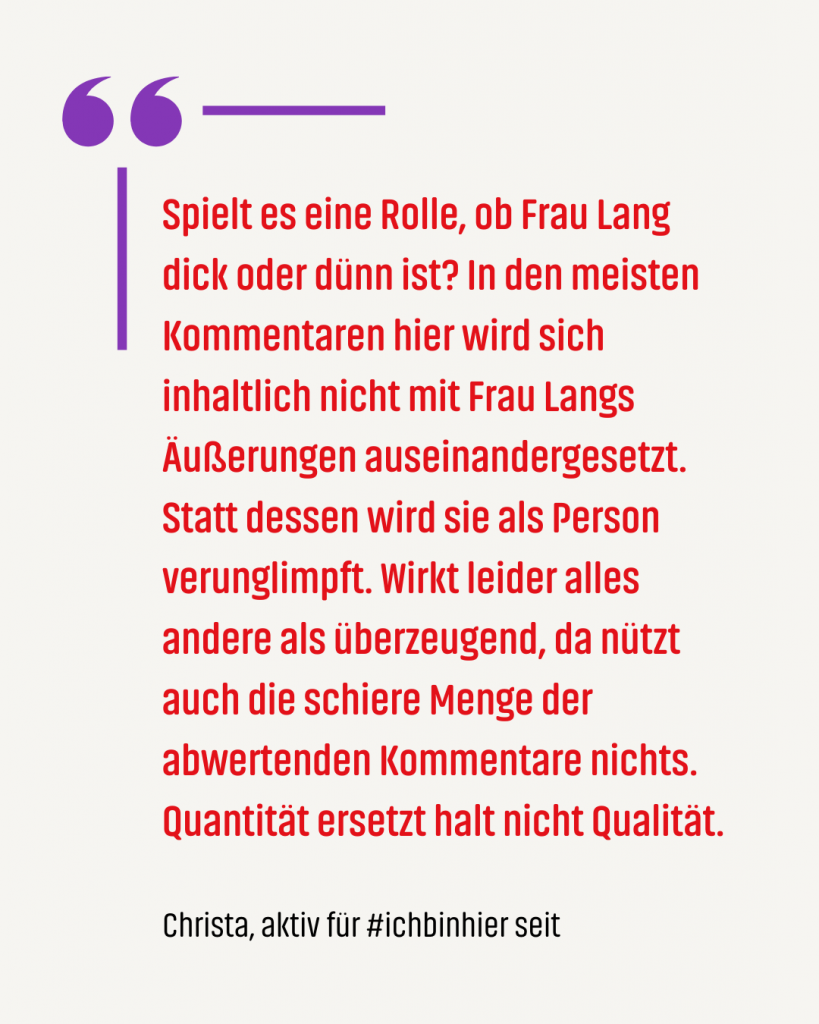 ”Die Zyniker und Rassisten haben leider sehr gut verstanden, wie man das Internet für seine Zwecke nutzt. Wir dürfen es ihnen nicht überlassen, wir müssen präsent und laut sein. Grade darum finde ich #ichbinhier so wichtig: es zeigt einem immer wieder, wir sind mit unseren Ansichten nicht alleine. Und das ist ein sehr gutes Gefühl.“