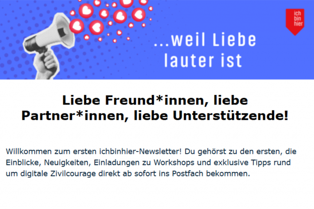 Wir vereinen Menschen, die Social Media zu einem Ort der Vielfalt und des Zusammenhalts machen wollen. Gemeinsam mit der #ichbinhier-Community und durch Bildungsformate setzen wir uns gegen Hass im Netz ein. So stärken wir Betroffene und fördern Mitgefühl, Meinungsfreiheit und Demokratie im Digitalen.