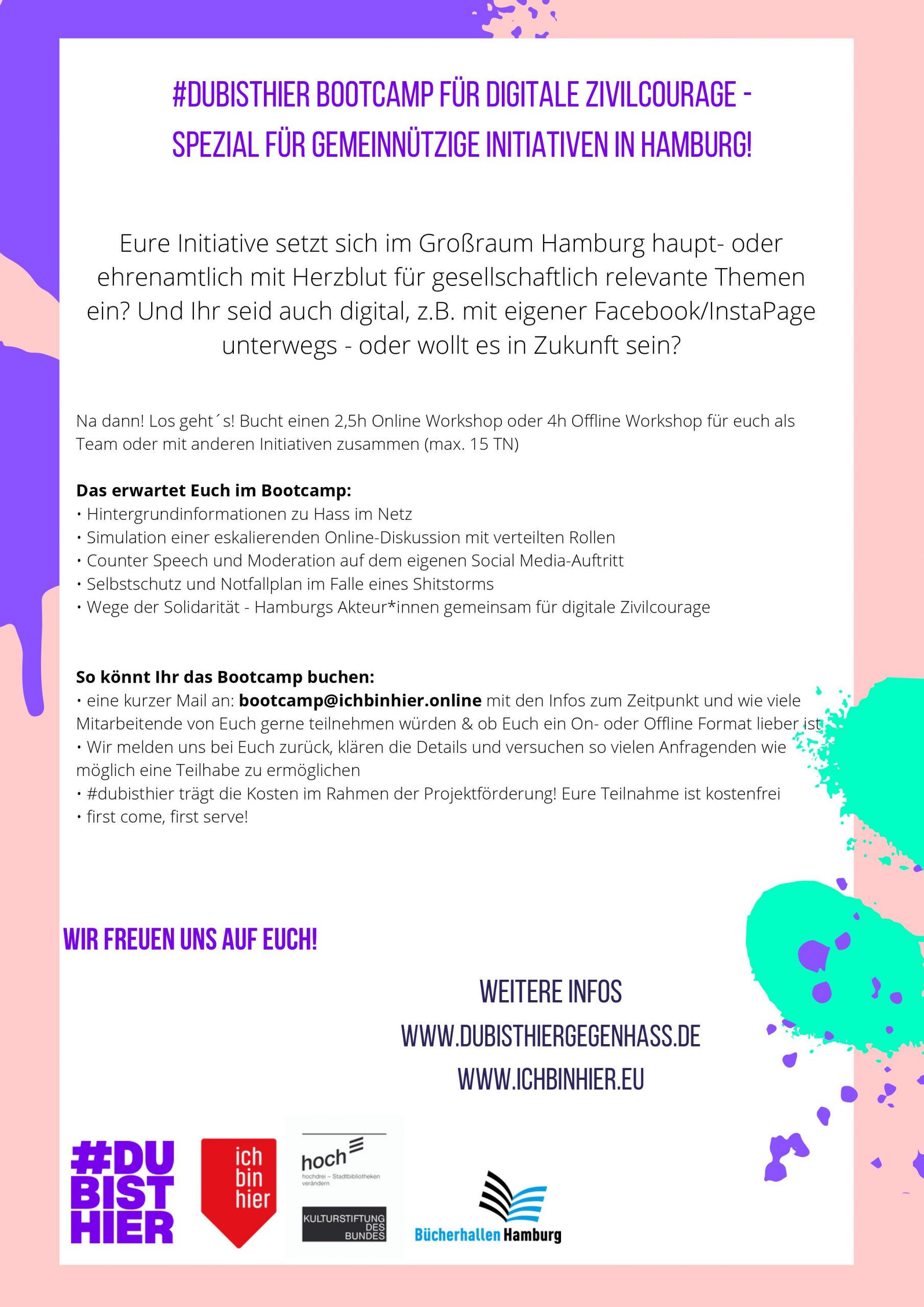 #dubisthier und der ichbinhier e.V. bieten ab sofort Organisationen, Initiativen und anderen Akteur*innen der Hamburger Stadtgesellschaft an, sich gegen Hass im Netz und für digitale Zivilcourage zu wappnen. In Online- oder Offline-Formaten bieten wir alle nötigen Informationen, Tipps und Tricks. Mehr Informationen findet ihr hier: