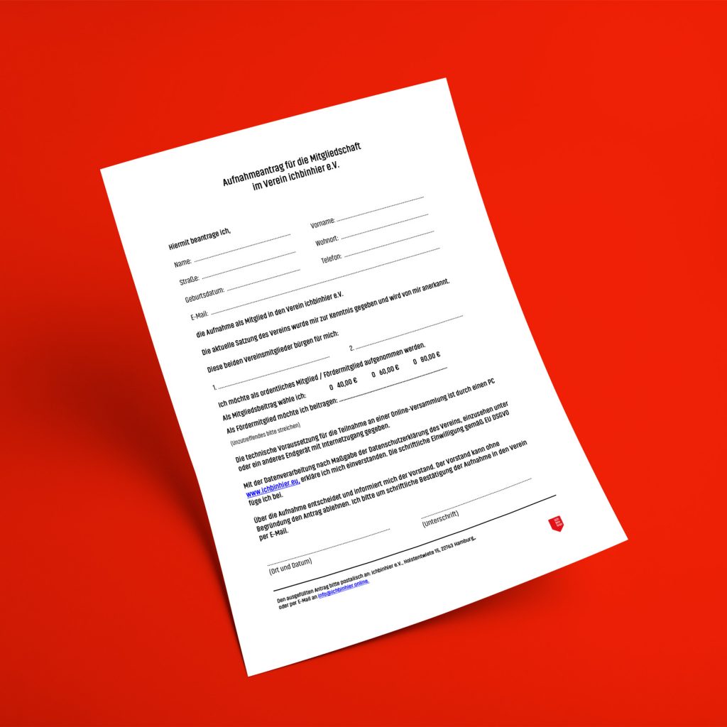 Ich willige ein, dass der Verein ichbinhier e.V. als verantwortliche Stelle die in der Beitrittserklärung erhobenen personenbezogenen Daten wie Namen, Vornamen, Geburtsdatum, Adresse, E-Mail-Adresse und Telefonnummer nach Maßgabe der Datenschutzerklärung des Vereins ausschließlich zum Zwecke der Mitgliederverwaltung und der Übermittlung von Vereinsinformationen durch den Verein verarbeitet und zum Zwecke der Kommunikation nutzt wie folgt: